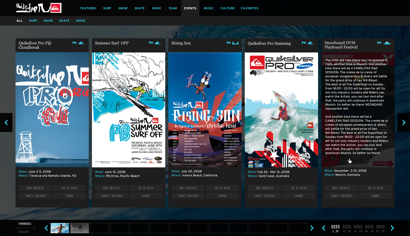 Proposed redesign for Quiksilver’s video site. The intention here was to group into this minimalist interface all the different sports categories combining events, athletes and culture.