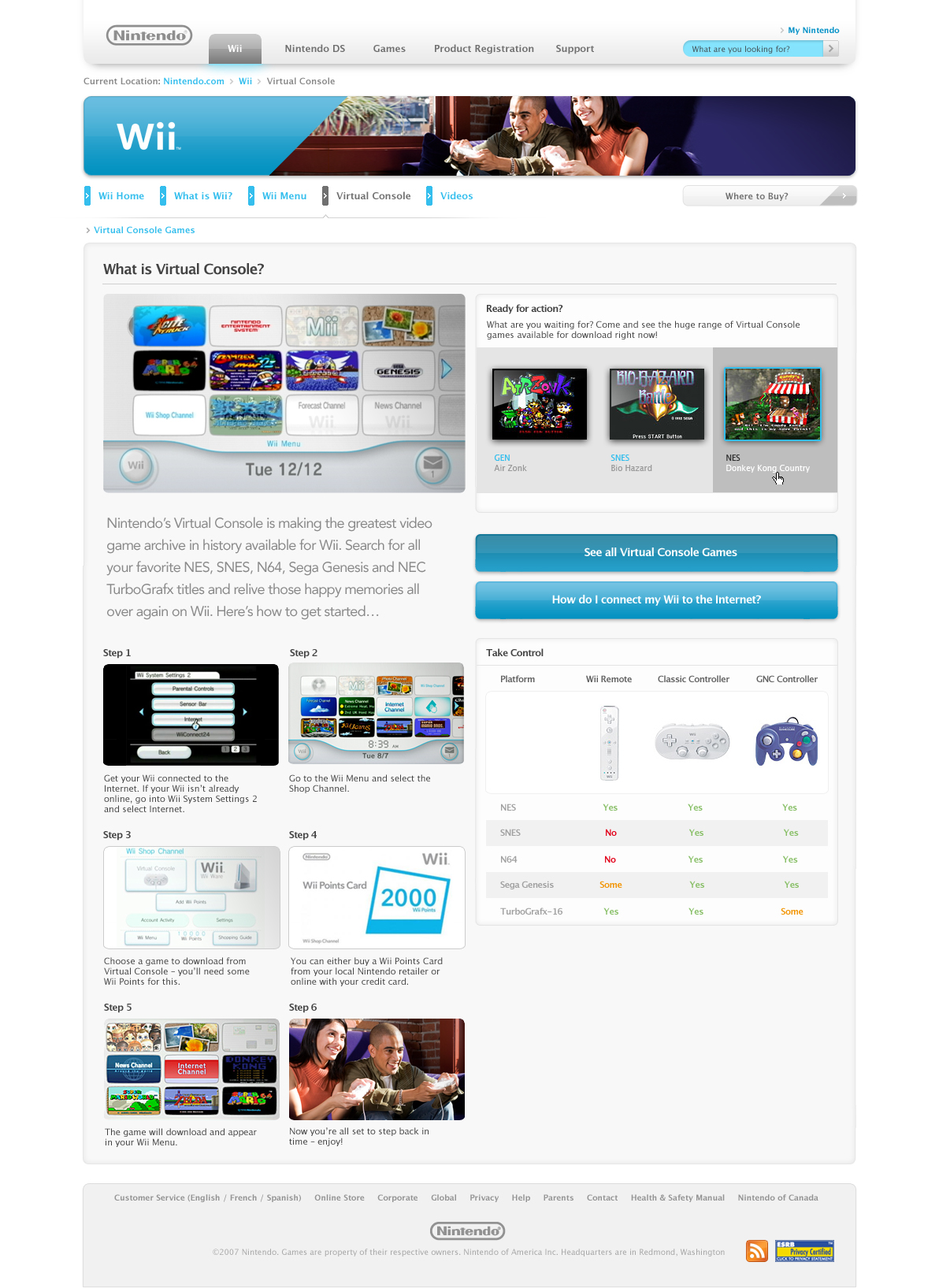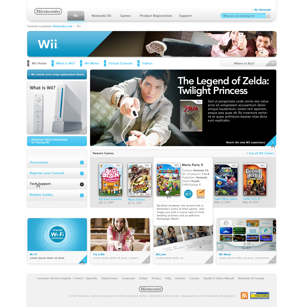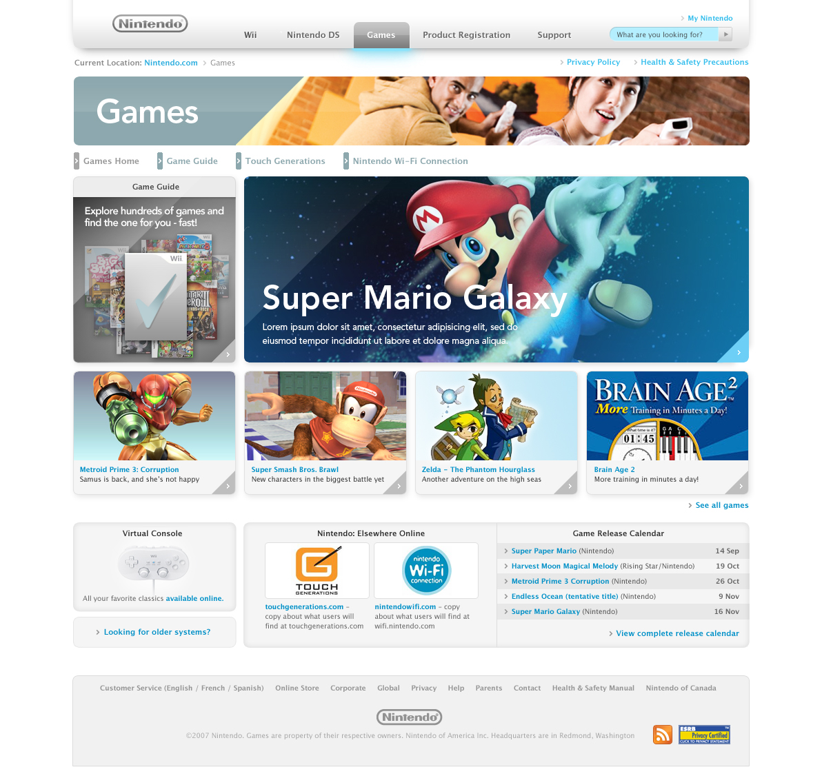 This is the third version of Nintendo’s website for North America. In these designs you’ll notice that the mascots and character’s presence were diminished to promote people’s interaction with the new hardware.